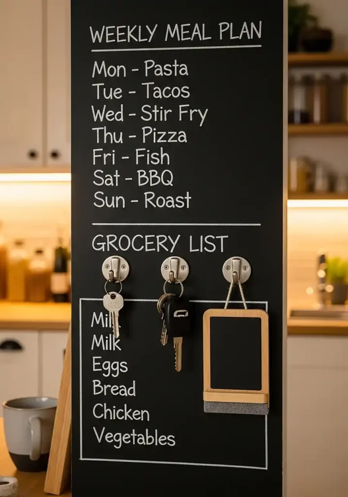 Chalkboard paint is renter-friendly if you clear it with your landlord first, or you can use a large framed chalkboard panel that leans against the wall or hangs with a single nail. Style it with colored chalk markers for meal plans, white chalk for grocery lists, and a small ledge tray for the chalk itself. Add small command hooks below for towels, pot holders, or even a mini herb garden basket. It’s organization that actually looks beautiful.