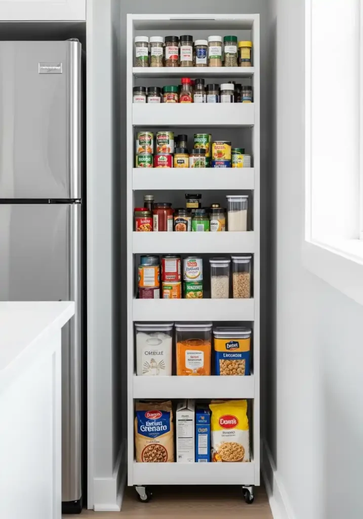 That awkward 6-to-10-inch gap between your refrigerator and the wall? It’s not wasted space — it’s a hidden pantry waiting to be unlocked. Slim rolling pantry carts are designed specifically for these gaps and they pull out to reveal multiple shelves of beautifully organized canned goods, spices, oils, and snacks. For apartment kitchens with zero pantry space, this feels like discovering a secret room. Seriously, it’s that satisfying.