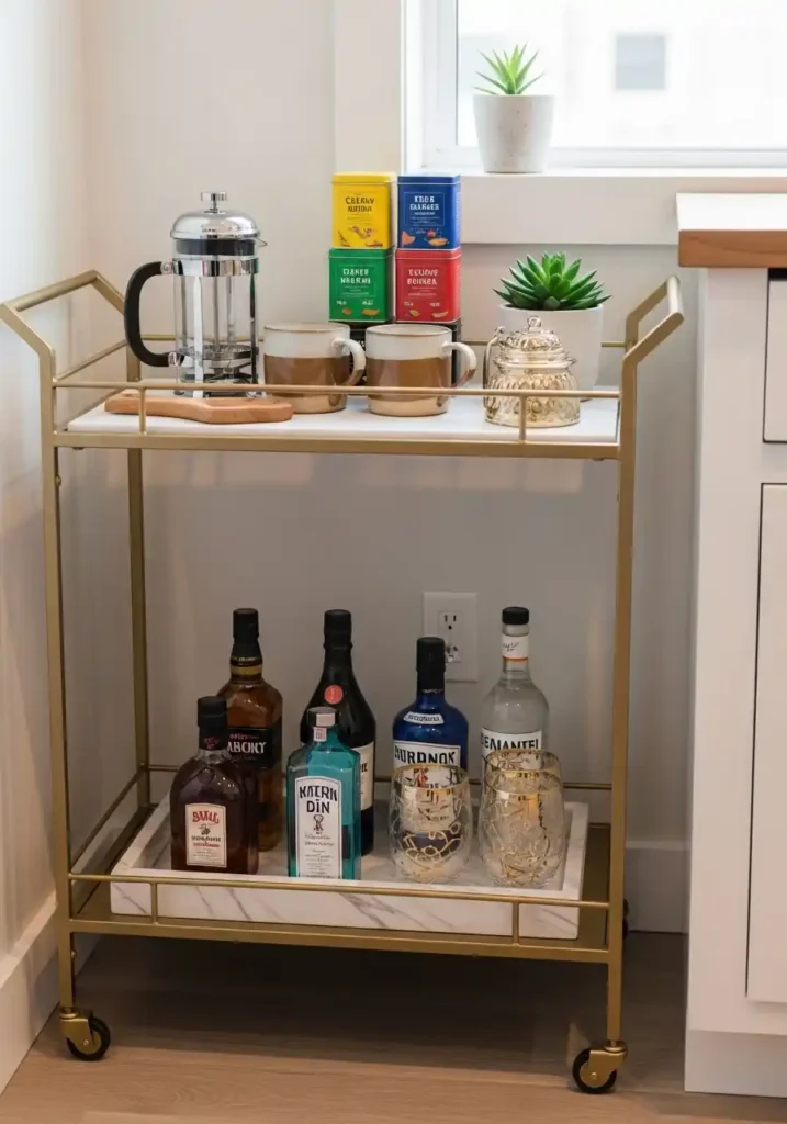 In a small apartment kitchen, every inch of counter and cabinet space is spoken for. So when your coffee maker, electric kettle, mugs, pods, and tea collection are all competing for the same real estate, something’s gotta give. Enter the bar cart — repurposed not for cocktails (well, not exclusively) but as a dedicated beverage station. Roll it into a corner, load it up, and suddenly your counters breathe freely while your morning coffee routine has a proper, beautiful home.