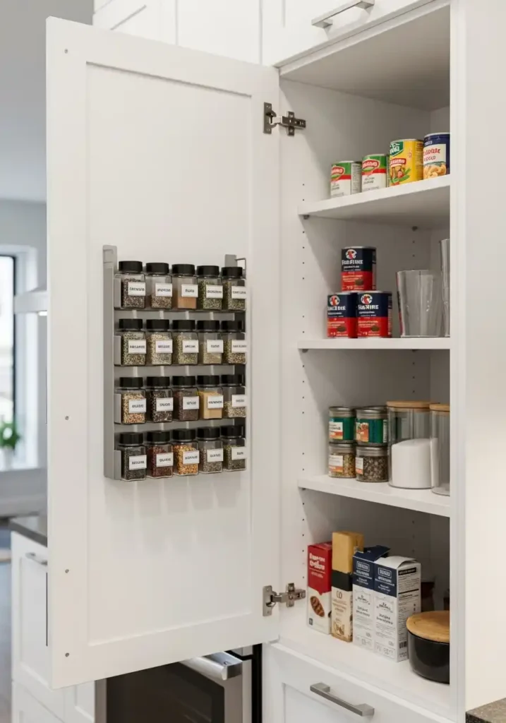 Your spice collection is probably one of the most disorganized parts of your kitchen right now — and it’s not your fault. Most apartments give you a single shelf to pile them all on, which means you’re always digging, always knocking things over, and always buying cumin when you already have three jars of it. Mounting a spice rack to the inside of a cabinet door solves every single one of these problems in one elegant swoop.