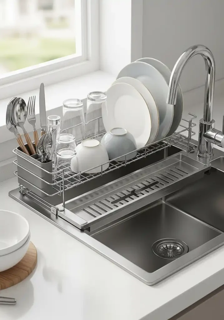 Look for expandable designs that fit different sink widths, with multiple tiers for dishes, glasses, and cutlery. Stainless steel resists rust and wipes clean easily. Some versions include a wine glass holder, a fruit bowl section, or a small cutting board on top — giving you additional workspace right over your sink. When dishes are dry, they’re easy to put away because the rack is centered right between your cabinets. Clean dishes, clear counters, happy kitchen.