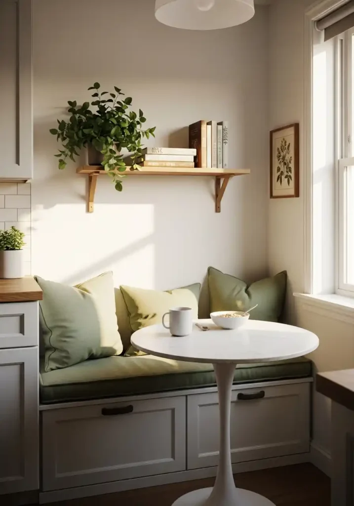 The built-in bench in a nook is also secret storage heaven — add hinged lids and you have a chest where extra kitchen linens, serving pieces, or even wine lives. Keep the table small and round to accommodate as many people as possible without sharp corners to navigate around. Mount a shelf above the nook for a plant, a small lamp, or a little art piece. This is the kind of corner that makes apartment living not just manageable, but genuinely, deeply delightful.