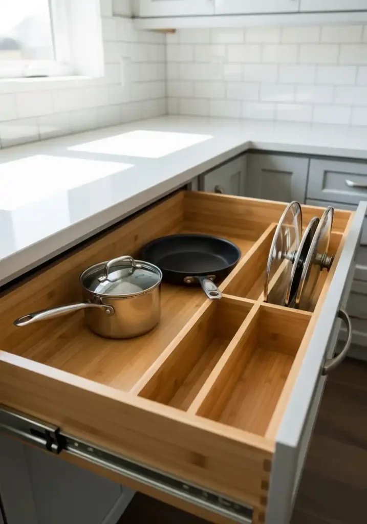 Bamboo drawer dividers and soft fabric inserts are the most popular options for cookware. You can also repurpose tension rods laid horizontally to create sections. Store your most-used pans on top, specialty pans below, and tuck lids vertically between a pan and the drawer wall. Deep drawers are actually superior to lower cabinets for pots and pans because everything is visible from above the moment you open it — no squatting, no reaching into the dark back corner, no avalanche of lids.