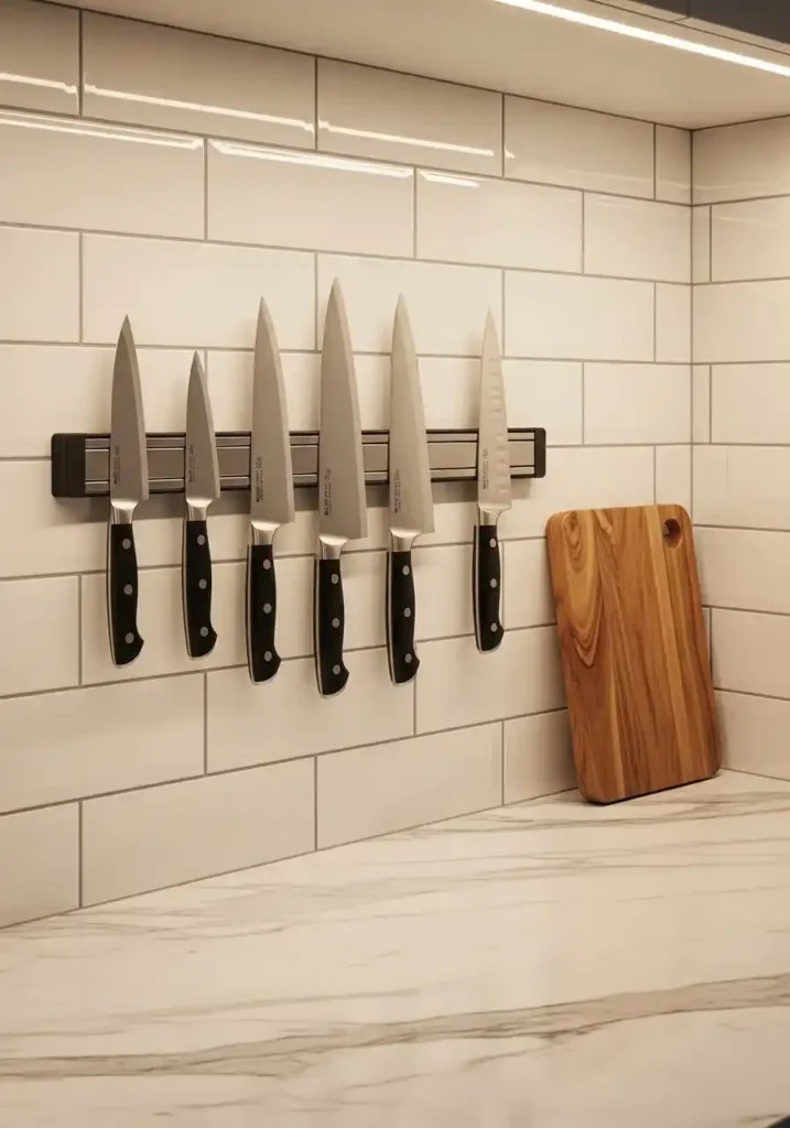If your kitchen drawers are already overflowing and you haven’t even started cooking dinner yet, a magnetic knife strip is about to become your new best friend. Mounting one directly on your backsplash frees up a full drawer, keeps your knives sharp (no more rattling against silverware), and honestly? It looks incredibly professional and intentional. It’s one of those tiny changes that makes your apartment kitchen feel seriously grown-up.
