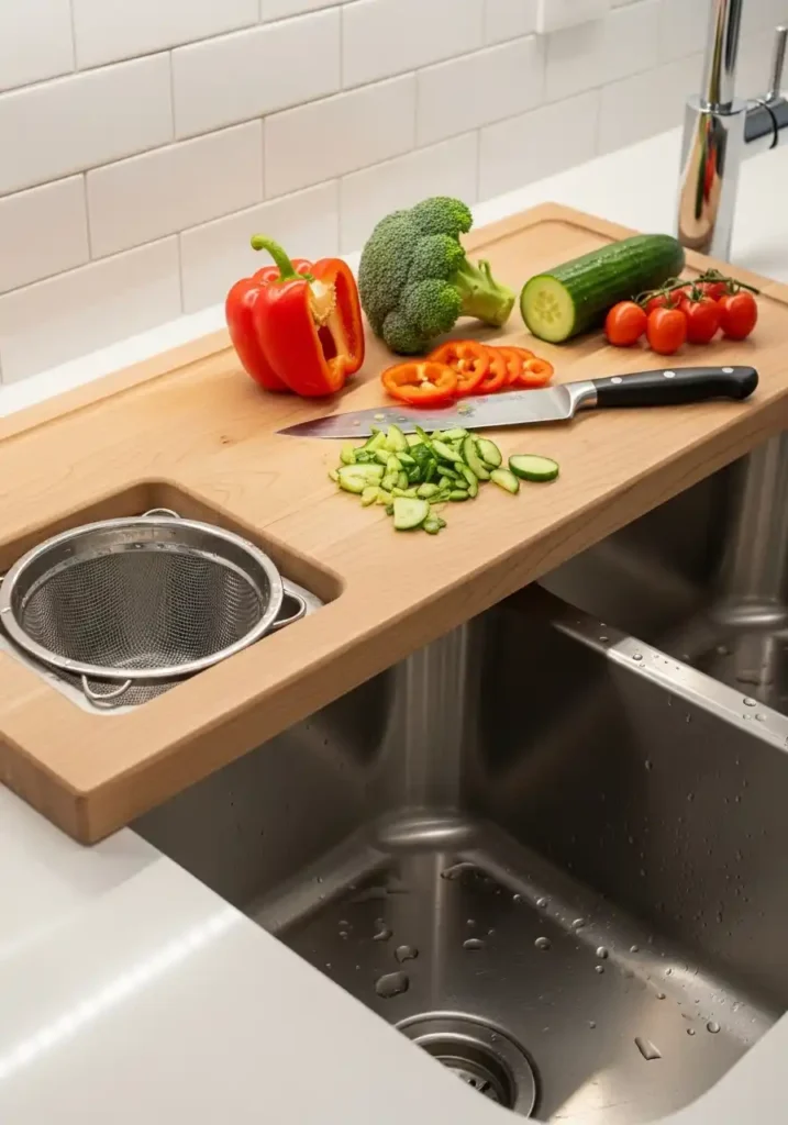 Look for ones made from bamboo or solid hardwood with a built-in colander or strainer insert. Some even have juice grooves to catch any liquid runoff. They fit over most standard sink sizes and store neatly beside the sink or in a cabinet when not in use. It’s an incredibly affordable upgrade — usually under $40 — that makes your daily cooking routine smoother, faster, and honestly, a little more enjoyable. Small space, big impact.