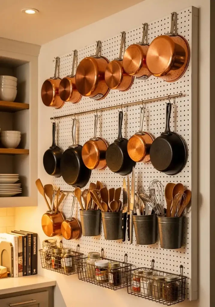 A pegboard wall sounds like something you’d find in a garage, but trust us — styled correctly, it’s one of the most Pinterest-worthy things you can do to an apartment kitchen. It turns an entire blank wall into a fully customizable storage system for your pots, pans, ladles, whisks, and even spice jars. Everything hangs in plain sight, completely accessible, and you never have to dig through a cabinet again. It’s the kind of solution that makes you wonder why you didn’t do it sooner.