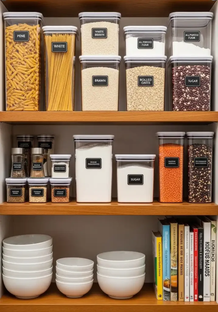 Square containers stack more efficiently than round ones, making the most of every shelf inch. Choose clear containers so you can see at a glance when you’re running low, and label everything with a chalkboard or printed label for that extra polished look. OXO, IKEA’s 365+, and Amazon Basics all offer excellent budget-friendly sets. Yes, decanting takes an afternoon of effort. But once it’s done, grocery restocking becomes easier, food stays fresher longer, and your pantry shelf becomes genuinely joy-inducing to open.