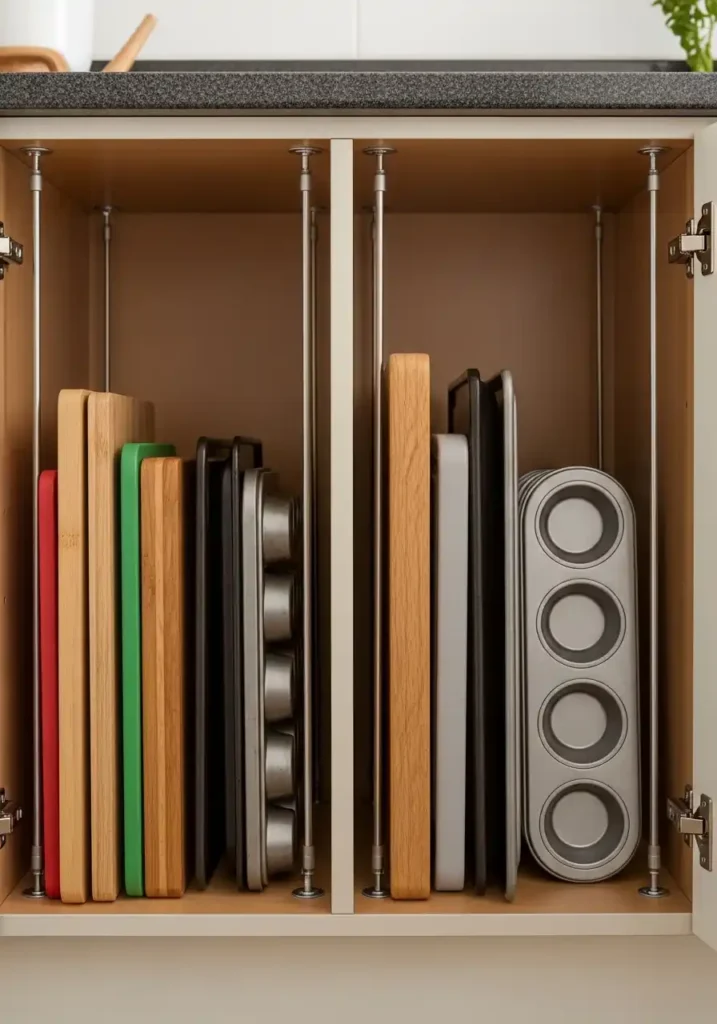 You know that chaotic cabinet where all your flat things — baking sheets, cutting boards, cooling racks — slide into a pile every time you open the door? Two tension rods installed vertically inside that cabinet will change your life forever. No drilling, no tools, no adhesive. Just press-fit them in, and suddenly your flat items stand upright like books on a shelf, completely sorted and incredibly easy to pull out one at a time.