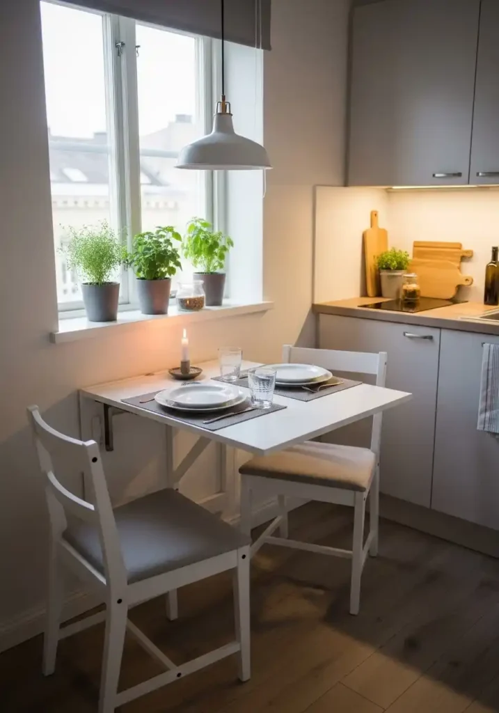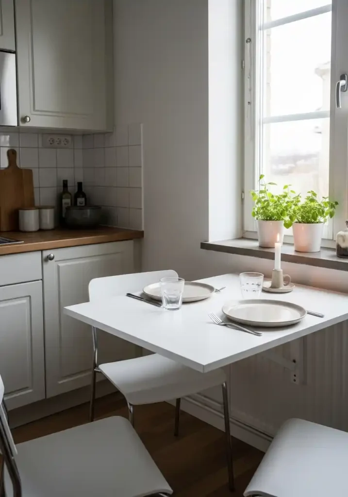 IKEA’s NORBERG is the most famous and affordable option, but dozens of designers now offer beautiful fold-down tables in wood, painted MDF, and even concrete-effect finishes. Mount it at bar height with stools for a casual café feel, or at standard dining height for a more traditional setup. Add a small shelf beneath to store placemats, napkins, or even a wine glass rack. In truly tiny apartments, the fold-down table is the difference between eating at your kitchen counter and actually sitting down for a proper, civilized meal.