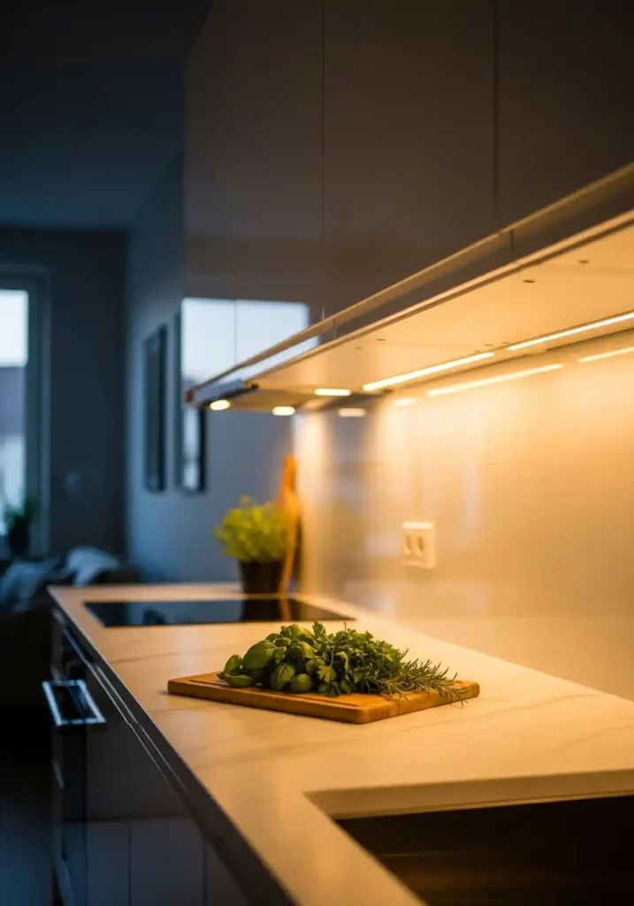 Lighting is one of the most underestimated elements of apartment kitchen design. Most apartments come with a single overhead light that casts flat, unflattering light across the whole room. Adding LED strip lights under your upper cabinets (or floating shelves) changes everything. Your countertop becomes properly lit for cooking, the kitchen feels warmer and more inviting, and the whole space suddenly looks like it was professionally designed. It’s ambiance and function all in one.
