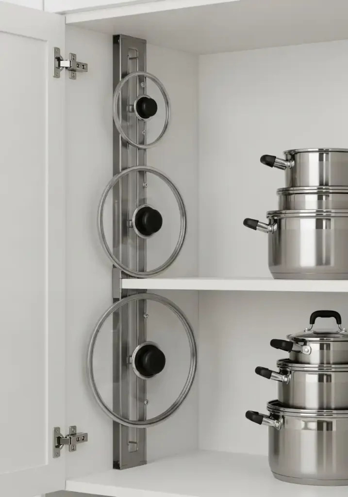 Can we talk about pot lids for a second? They’re the rogue socks of the kitchen world — they never stay where you put them, they slide around, they fall out of cabinets at the worst possible moments. Mounting a vertical lid organizer to the inside of your cabinet door is the elegant solution to this very chaotic problem. Lids stand upright, stay sorted by size, and the inside of your cabinet door — previously dead space — suddenly becomes prime real estate.