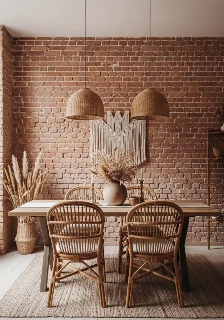 Exposed brick or raw plaster walls in a boho dining room provide the most powerful architectural backdrop available for this aesthetic — because the warm, imperfect, genuinely textured surface of aged brick or hand-applied plaster communicates everything that the boho aesthetic values most directly: authenticity, imperfection, material honesty, and the specific beauty of things that show how they were made and how they have aged. A wall of warm terracotta brick beside the dining table creates a dining backdrop of such extraordinary character that the room needs very little additional decoration to feel complete and completely beautiful.