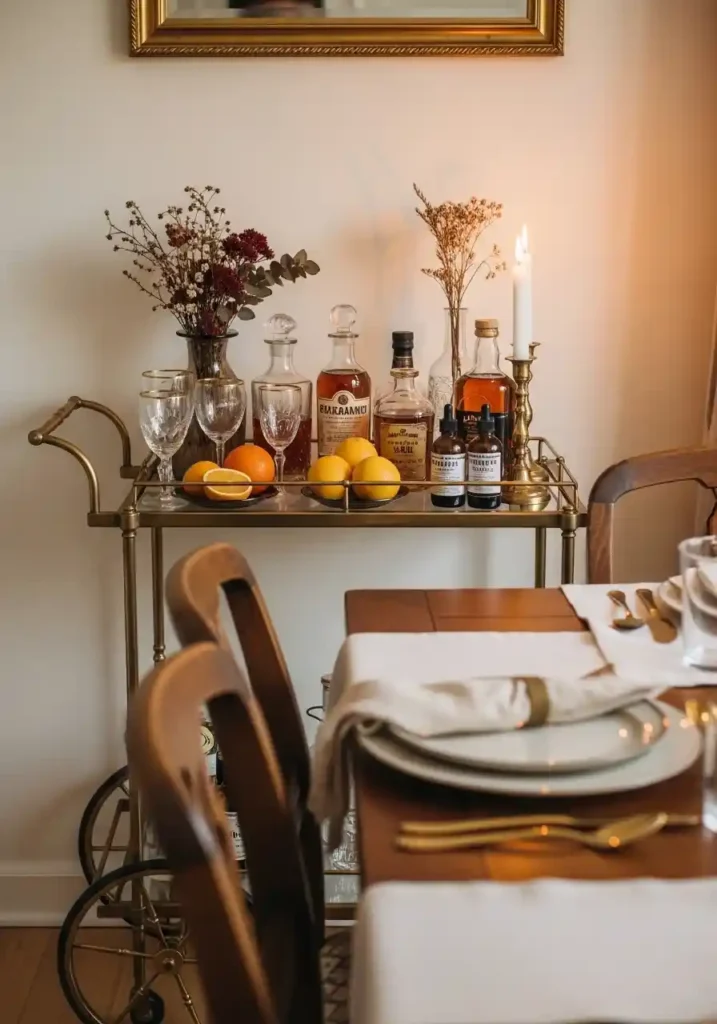 A vintage bar cart positioned thoughtfully within the boho dining room — not as a purely functional drinks storage solution but as a carefully curated ritual space that elevates the act of preparing and serving drinks to a ceremonial, deeply pleasurable part of the dining experience — adds a specific layer of hospitality and convivial warmth that the most beautifully designed dining table alone cannot provide. A vintage brass cart styled with antique glassware, beautiful decanters filled with warm amber spirits, fresh citrus, and small botanical arrangements transforms the pre-dinner drinks moment into a genuine experience.