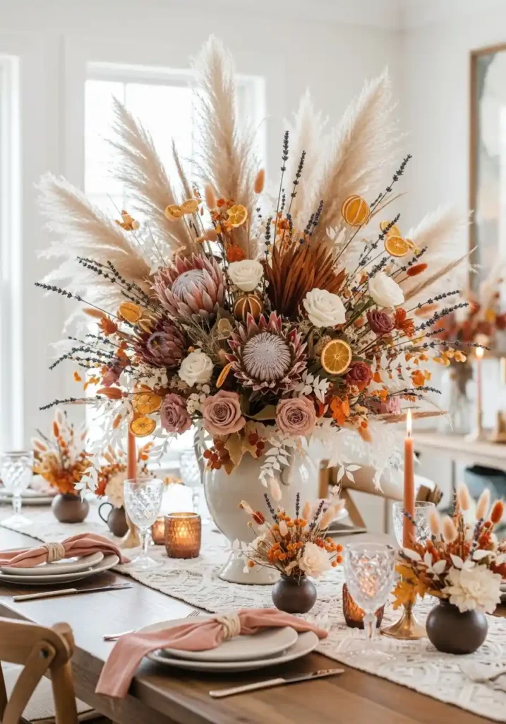 An abundant, overflowing dried flower arrangement as the centerpiece of a boho dining table creates a focal point of such organic generosity and natural beauty that every meal served beneath it feels like a celebration. The specific beauty of dried flowers for the dining room is their permanence — unlike fresh flowers that must be replaced weekly, a beautifully assembled dried arrangement of pampas grass, dried proteas, bunny tail grasses, dried roses, and dried orange slices develops and matures over months and even years of display, the colors gradually softening and deepening into a warm, slightly faded beauty that is more beautiful than the arrangement’s original freshness.