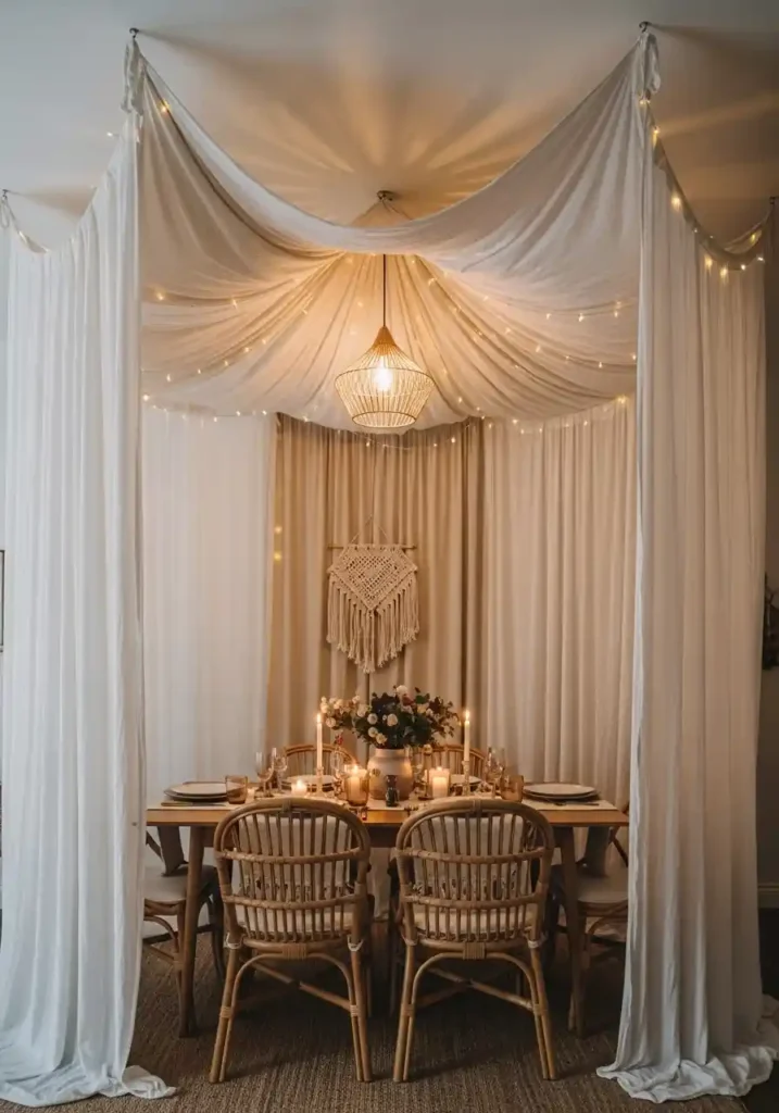A dramatic fabric canopy above the dining table — created by gathering multiple panels of sheer linen or lightweight cotton from a central ceiling point and draping them outward to wall-mounted hooks at the room’s perimeter, creating a tent-like canopy that encloses the dining area within a soft, warm fabric sanctuary — transforms the dining experience more completely than almost any other single design intervention available. The canopy creates a specific psychological enclosure around the dining table that makes everyone seated within it feel specially contained, specially gathered, and specially present in a way that an open-ceiling dining room cannot replicate.