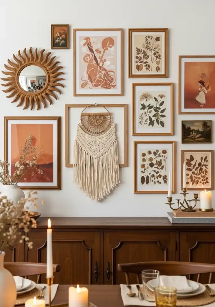 A boho gallery wall that mixes warm-toned art prints, mirrors, woven wall hangings, and vintage paintings in an organic, asymmetric arrangement is the dining room wall treatment that most completely and most beautifully communicates the boho aesthetic’s fundamental philosophy — that beauty comes from the combination of different things, from different sources, collected over time and arranged with genuine personal feeling rather than geometric precision or stylistic uniformity. The gallery wall tells the story of the people who live there through the specific objects they choose to surround themselves with at the dining table.