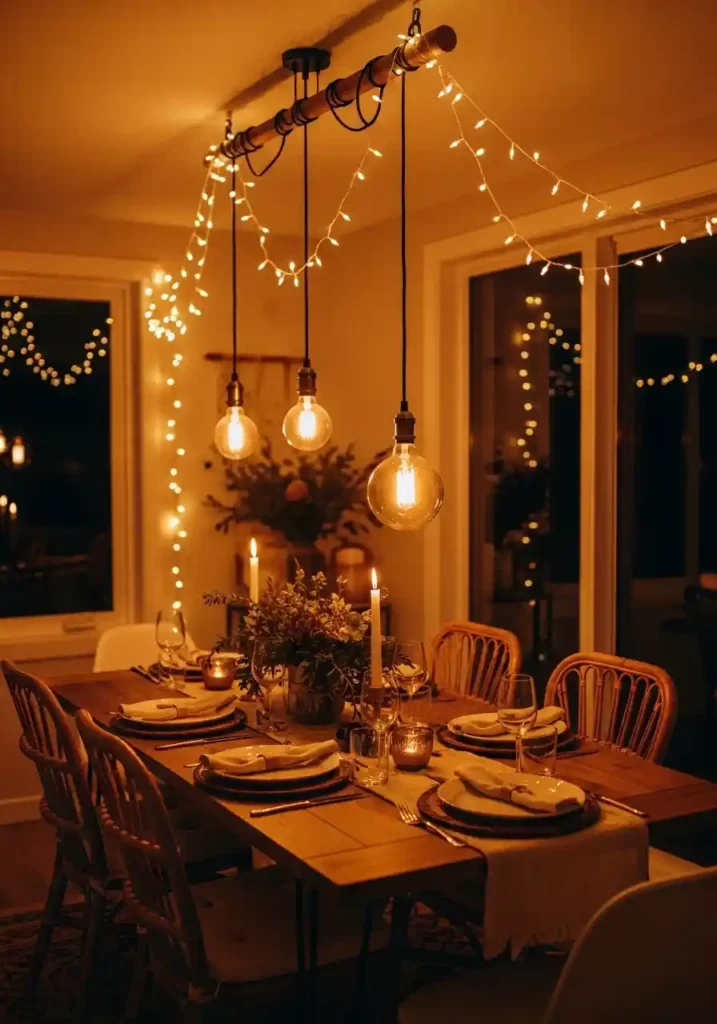 String lights draped in relaxed, slightly dipping catenary curves above the dining table — combined with warm Edison bulb pendant lights hanging at the table’s center — create the most atmospherically beautiful and most quintessentially boho dining room lighting available. The double layer of warm light sources creates a layered luminosity that is both functional (providing sufficient illumination for comfortable dining) and extraordinarily atmospheric (creating the warm, amber-glowing quality of light that makes everyone in the room look beautiful and every conversation feel worth continuing indefinitely).