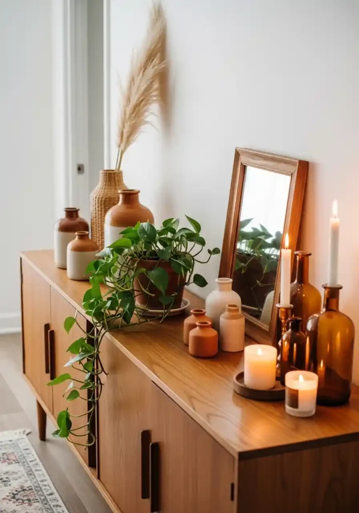 16. Boho Sideboard Styling with Plants and Vintage Objects