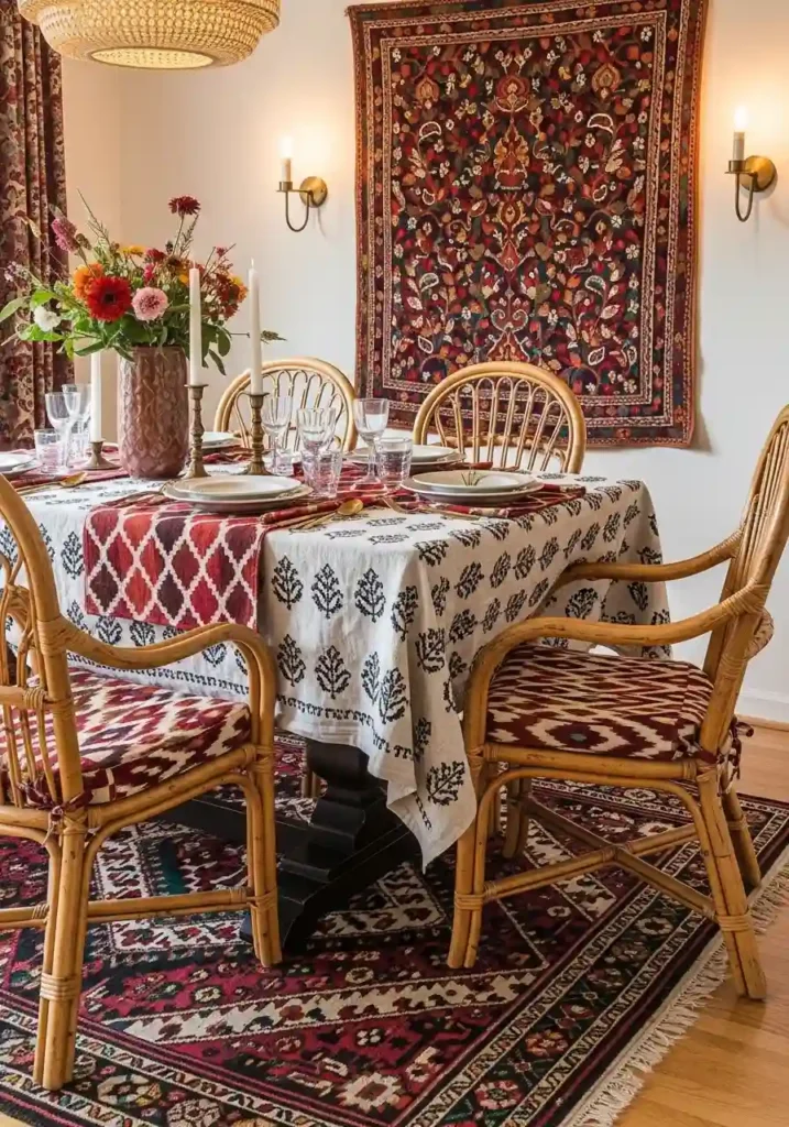 Global-inspired textiles mixed together in the boho dining room create an atmosphere of worldliness, curiosity, and genuine cultural appreciation that no single-source design approach can replicate — the combination of a Moroccan geometric pattern on the table runner, an Indian block print on the tablecloth below it, ikat-patterned cushions on the chairs, and a Turkish kilim beneath the table tells a story of someone who has traveled widely, looked carefully, collected deliberately, and understands that beauty is genuinely universal and genuinely diverse. This is the dining room of an interesting person with an interesting life.