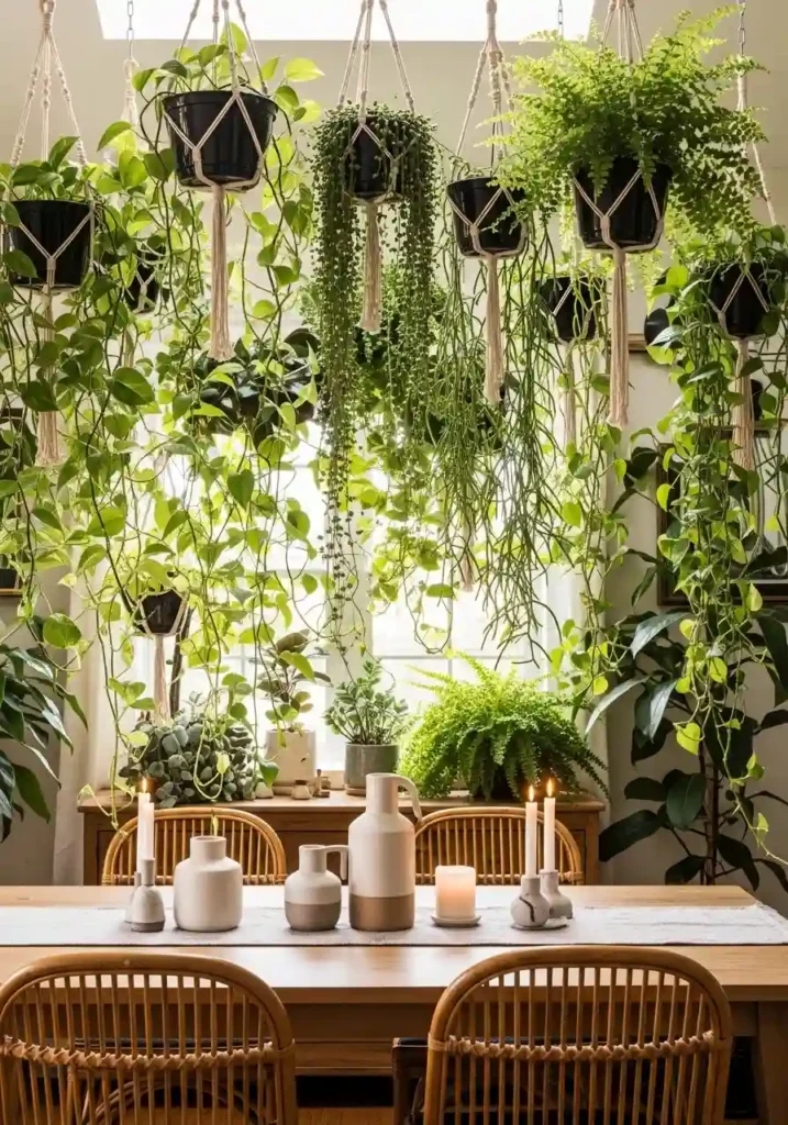 Hanging plants and trailing greenery positioned above and around the dining table create a dining experience that is genuinely unlike any other — the sensation of dining beneath a natural canopy of cascading leaves and trailing vines, with dappled light filtering through the greenery and the faint earthy scent of living plants surrounding the meal, transforms eating from a functional daily activity into something that feels connected to the natural world in a way that no other dining room design element can replicate. Plants overhead create the most specific and most memorable dining atmosphere available.