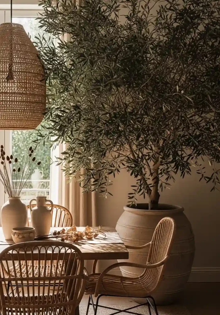 A large indoor olive tree or mature fiddle leaf fig positioned beside or behind the dining table is the single living element that most dramatically and most immediately transforms a dining room from a designed space into something that feels genuinely alive, organic, and deeply connected to the natural world. The olive tree in particular has a specific Mediterranean warmth and a sculptural quality — its gnarled, characterful trunk and silvery-green leaves filtered by warm afternoon light — that makes it the most specifically beautiful and most distinctly boho of all indoor tree options for the dining context.