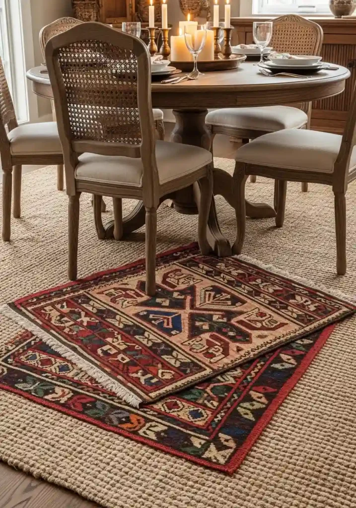 The jute or seagrass base layer rug provides the earthy, natural foundation of the floor composition — its texture is honest and organic, its color is warm and neutral, and its generous size creates a clearly defined dining zone within the room. The smaller kilim or vintage patterned rug placed on top provides the personality, the pattern, and the specific character that makes the floor truly boho — its worn edges, its slightly irregular pattern, and its warm, jewel-toned colors all speak to genuine history and genuine beauty. Position the smaller rug slightly off-center and rotated a few degrees from perfect alignment with the table for the most naturally beautiful, most genuinely casual boho floor composition.