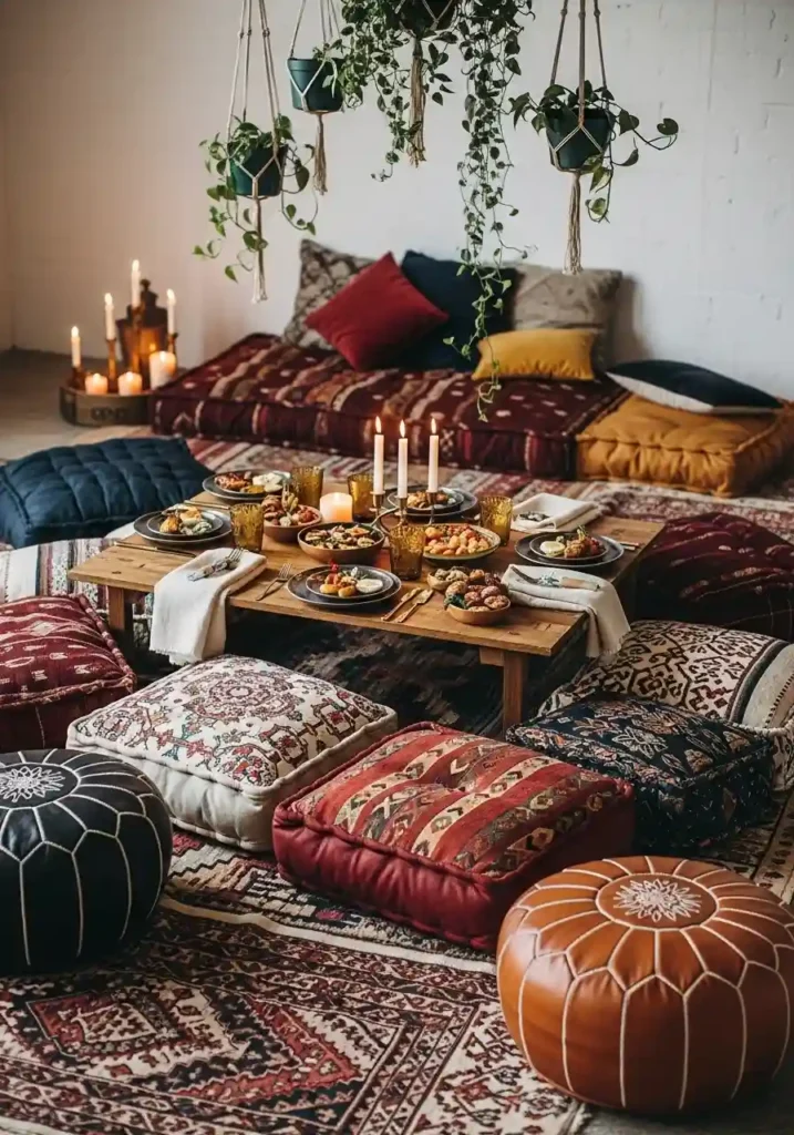 5. Low Seating with Floor Cushions for Casual Boho Gathering