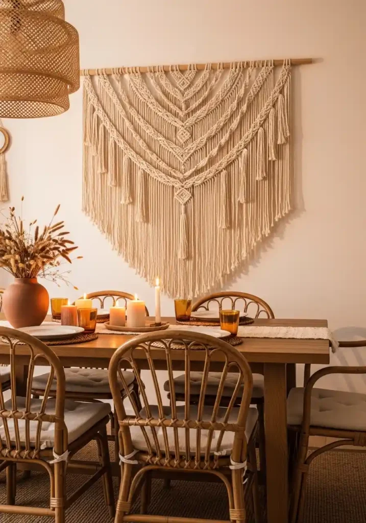 A large handmade macramé wall hanging mounted directly behind the dining table transforms that wall from a blank backdrop into the room’s most expressive, most personally meaningful element — one that communicates an appreciation for craft, for the time and skill involved in creating something with your hands, and for the specific beauty of natural materials expressed through human creativity. The intricate knotted texture of a well-made macramé piece creates extraordinary shadow play against the wall behind it as candlelight or warm lamp light shifts throughout the evening, giving the dining room a living, animated quality that flat art prints simply cannot offer.
