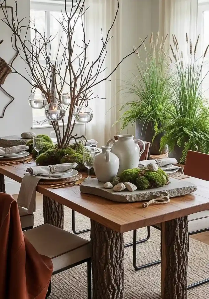 An outdoor-inspired boho dining room that brings the most elemental natural materials — stone, living moss, bare branches, wild grasses, and unprocessed wood — directly onto and around the dining table creates an eating experience of extraordinary sensory richness that makes guests feel simultaneously indoors and genuinely connected to the natural world. Tree branch centerpieces holding tea light candles within their forked arms, serving boards cut from natural stone with their rough edges intact, small arrangements of living moss beside ceramic vessels of foraged wild grasses — these elements transform the dining table into something that feels like it belongs in a forest clearing.