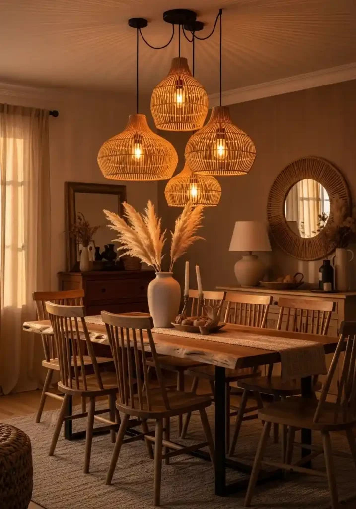 Nothing establishes the boho dining room’s character faster or more completely than a cluster of rattan pendant lights hanging above the table at varying heights — the warm, dappled light that filters through woven rattan creates exactly the kind of intimate, warmly ambient glow that turns every dinner into something that feels slightly ceremonial and worth savoring. Choosing three pendants in slightly different sizes and hanging them at different heights creates a composed, organic arrangement that looks collected rather than purchased as a set, which is the fundamental philosophy of the whole boho aesthetic.