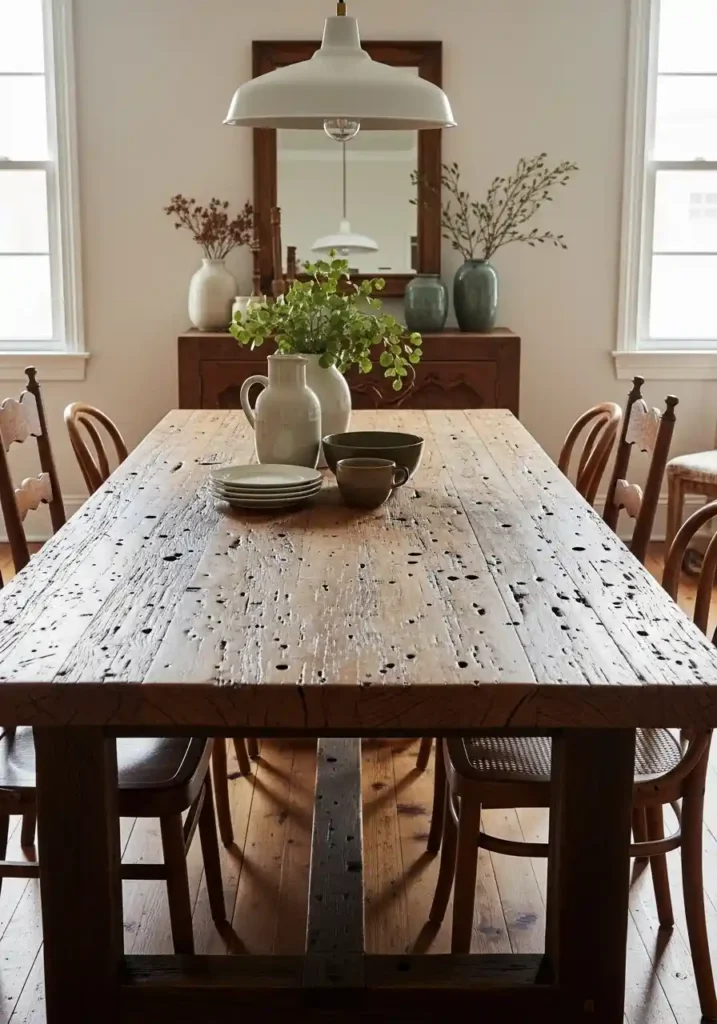 A dining table made from reclaimed wood is the most philosophically complete boho dining room choice available — it is sustainable, it is deeply beautiful, it is genuinely one-of-a-kind, and it carries a history within its material that new wood simply cannot possess. The visible nail holes from a previous life as barn siding, the rich dark grain of wood that has been exposed to decades of weather and use, the natural checking and movement in the surface that develops over years of drying — these are not imperfections but the most beautiful features of a reclaimed wood table, each one a mark of genuine life and genuine time.