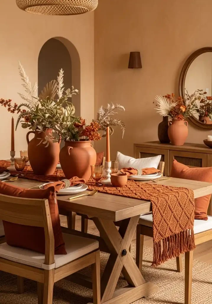 A terracotta and warm earth tone palette in the boho dining room creates an atmosphere that feels simultaneously ancient and completely contemporary — these are the colors of sun-baked clay and Mediterranean walls that have been absorbing and radiating warmth for centuries, and their presence in a dining room creates an immediate sense of groundedness, richness, and organic beauty that cooler or more neutral palettes cannot replicate with the same depth. Terracotta on the walls, burnt sienna in the textiles, warm sand in the linens, and cream in the ceramics all speak the same warm, earthy language.