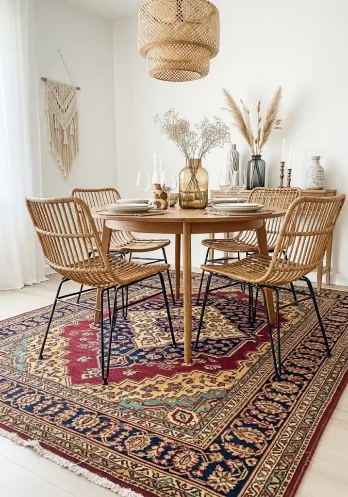Layering two rugs beneath the dining table — a large natural fiber rug as the grounding base layer and a smaller, more characterful vintage or patterned rug placed on top at a slight angle — creates a floor composition of genuine textile richness and visual complexity that makes the dining area feel like a specifically designed destination within the larger home rather than simply a place where a table happens to be positioned. The layered rug technique is a fundamental boho design principle because it introduces the kind of organic, accumulated-over-time quality that is central to the aesthetic’s spirit.