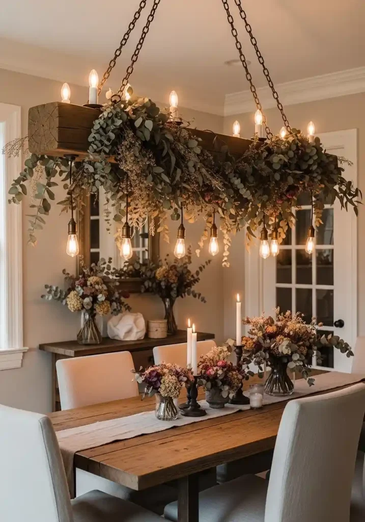 The dried botanicals draped along the wooden beam add a fragrant element to the dining experience — dried eucalyptus in particular releases its characteristic clean, slightly medicinal scent when the warmth of the bulbs heats the air around it, creating a subtle aromatic quality that makes the dining room appeal to the senses of both sight and smell simultaneously. Replace the botanical garlands seasonally — autumn brings dried orange slices, cinnamon sticks, and seed pods; winter brings evergreen branches and dried citrus; spring brings dried cherry blossom and lavender; summer brings dried sunflowers and wild grasses — keeping the dining room’s overhead installation fresh, fragrant, and seasonally alive throughout the entire year.
