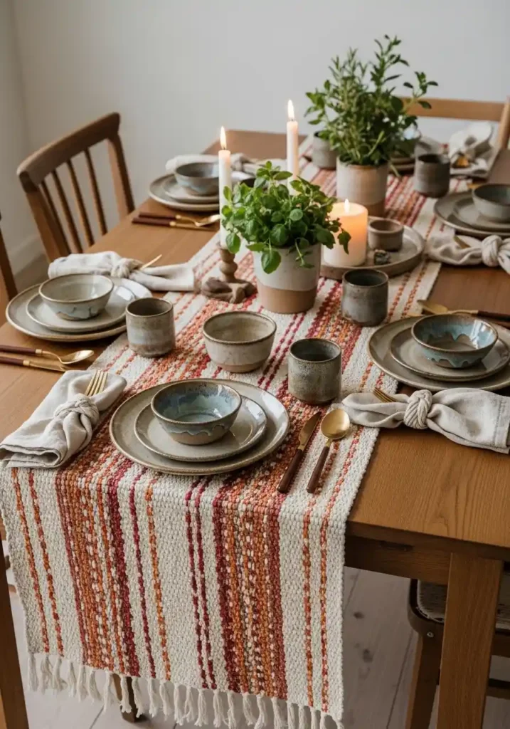 6. Woven Textile Table Runner with Handmade Ceramics