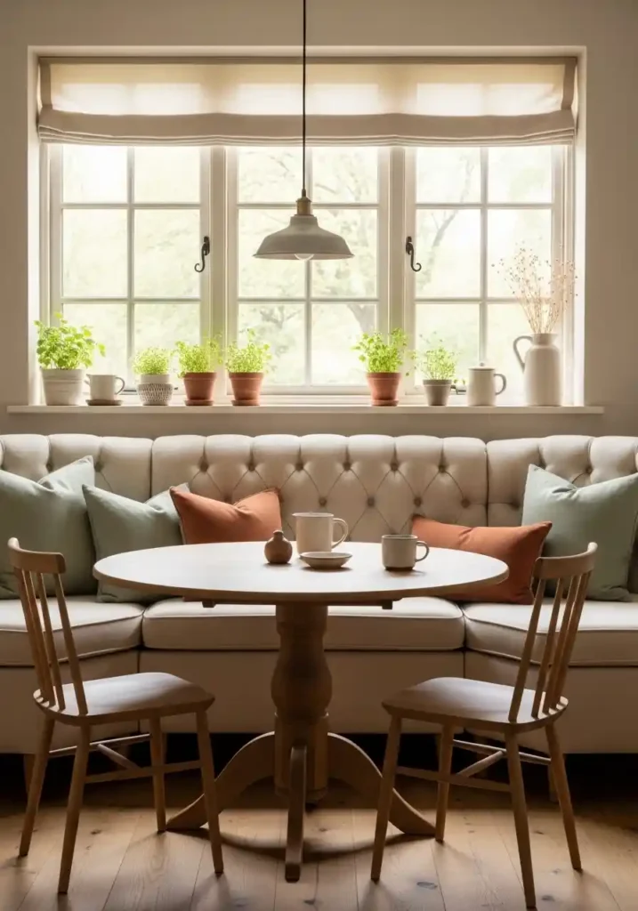 The positioning of a breakfast nook beside a window is the single design decision that most completely maximizes its cozy potential — natural light from a window above or beside the banquette creates the most beautiful quality of morning illumination, fresh herbs growing on the windowsill add fragrance and organic life to the breakfast experience, and the visual connection to the garden or the street outside provides the most naturally interesting morning entertainment available! A pendant light above the breakfast nook table creates warm, intimate evening illumination that transforms the morning coffee corner into an equally beautiful evening reading or homework space.