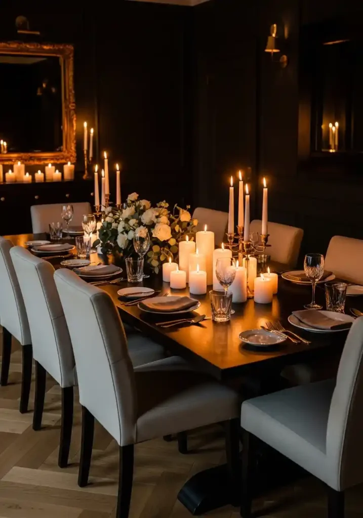 The most beautiful candlelit dining room styling combines multiple candle types at different heights throughout the tablescape — tall taper candles in elegant brass or silver candlesticks providing height and drama, medium pillar candles in varying heights grouped at the table center providing warm, abundant glow, and small tea lights or votives in glass holders scattered between the table settings providing intimate personal pools of warm light at each place! Never underestimate the transformative power of simply lighting every candle you own before dinner — the atmosphere changes instantly, completely, and genuinely magnificently.