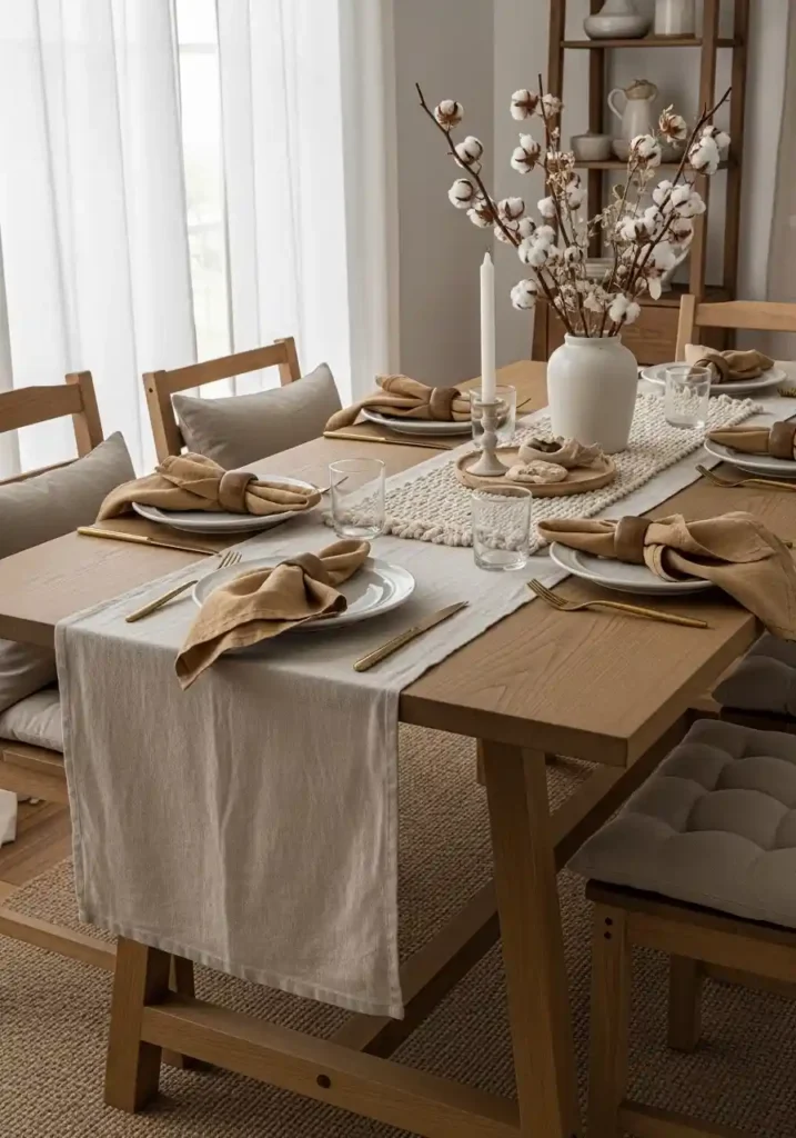 The most beautiful natural textile dining room is one that commits to the material philosophy consistently and enthusiastically throughout every textile element in the space — a long undyed linen table runner creating the primary horizontal textile element. Linen napkins at each place setting add tactile warmth at the most intimate level of the dining experience. Seat cushion pads in undyed cotton adding physical comfort to wooden chairs. Window curtains in natural white cotton filtering morning light with organic warmth. Each natural textile element reinforces the gentle, honest material story that makes the dining room feel genuinely, completely, and beautifully at peace with itself.