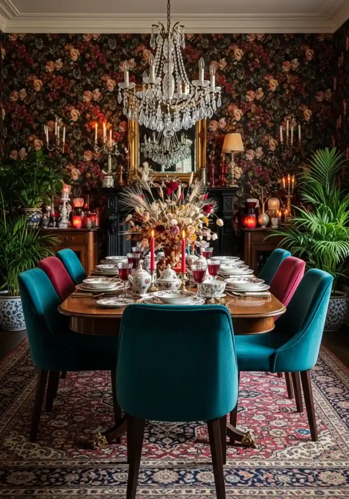 The practical framework that makes maximalist dining room design succeed rather than descend into visual chaos is a consistently maintained underlying color palette that provides coherence beneath the surface abundance of pattern and decorative complexity — choosing three dominant colors and ensuring that every wallpaper, every fabric, every ceramic, and every accessory in the room speaks at least one of those colors creates the visual unity that makes abundance feel curated rather than merely accumulated! Deep jewel tones of teal, burgundy, and gold create the most magnificently opulent maximalist dining room palette. Botanical green, warm terracotta, and cream create the most naturally beautiful and most warmly organic maximalist result.