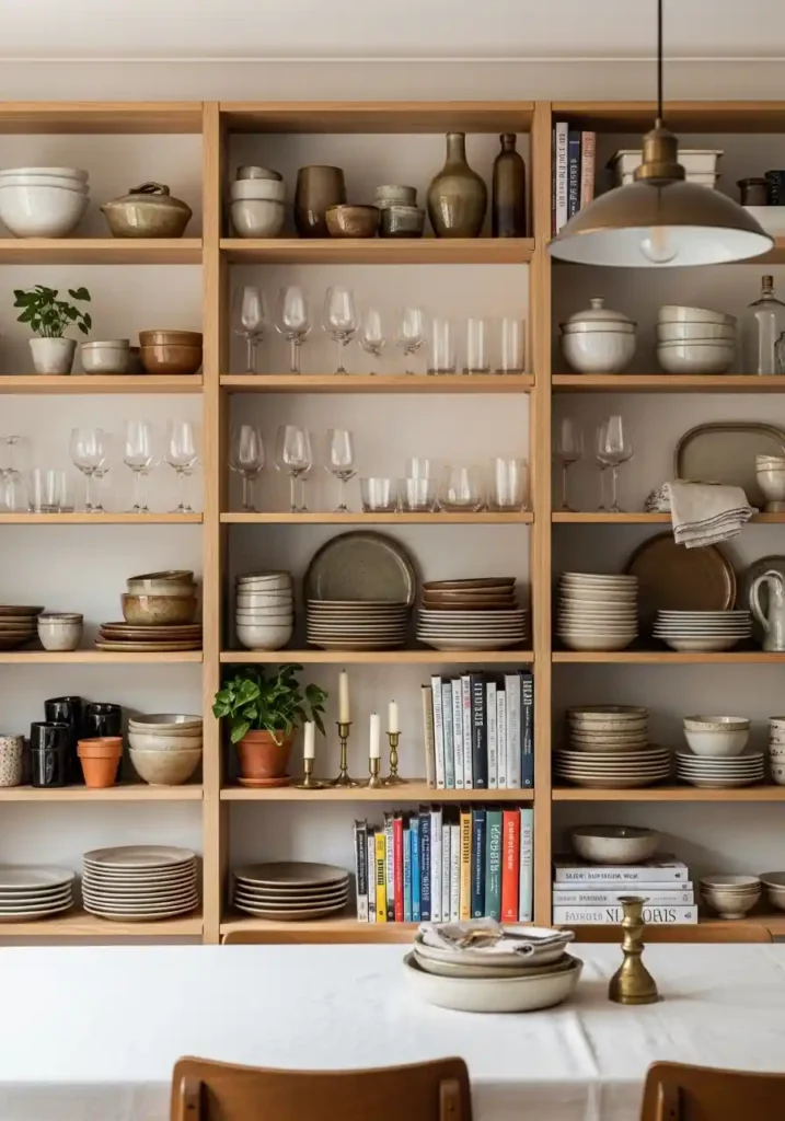 Open shelving in the dining room is the most warmly abundant, most visually characterful, and most practically accessible storage solution available — creating a beautifully displayed collection of tableware, glassware, linens, and cherished objects that adds genuine warmth and personal character to the dining room while keeping every item in active use completely accessible and continuously visible as part of the room’s daily beauty rather than hidden behind closed cabinet doors where it remains unseen and unappreciated between the specific occasions that warrant its retrieval!