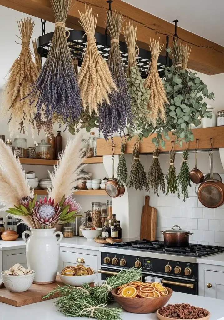 The ceiling beam hung with large, generous bunches of dried lavender, wheat, and eucalyptus is the dried botanical installation that creates the most dramatically beautiful and the most completely warm and farmhouse-natural kitchen display available — because bunches of dried botanicals hung from above create a softly fragrant, gently rustic ceiling treatment that transforms an architectural structural element into a living, organic feature of extraordinary warmth and beauty. The bunches should be generous, full, and varied in botanical species to create the richest and the most aromatically complex display — the visual and fragrant fullness of the dried botanicals communicating the same quality of natural abundance that makes a harvest celebration genuinely joyful.