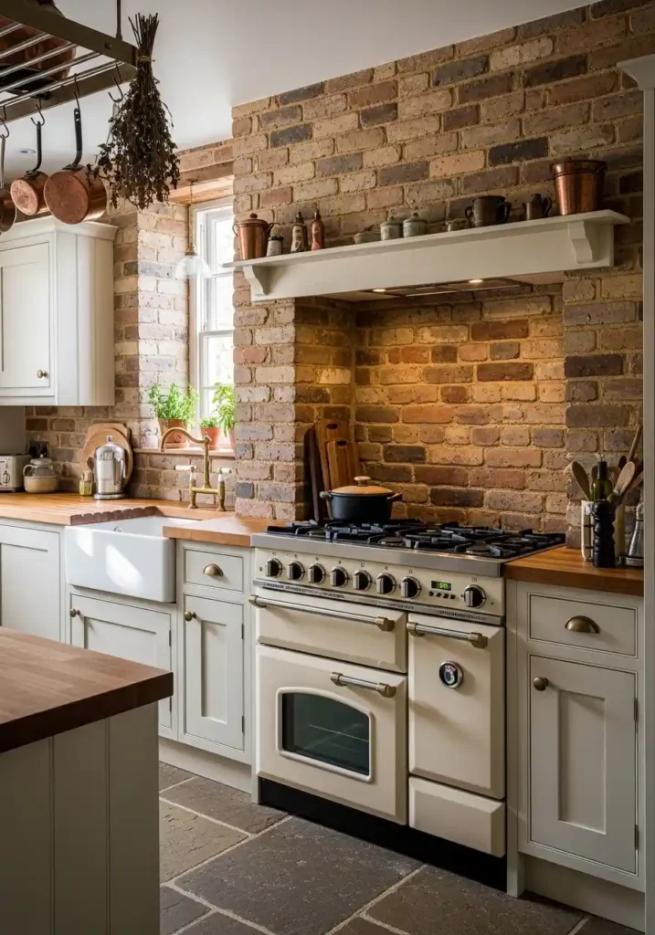 The warm ochres and russets of old brick — the specific, slightly varied range of warm earth tones that occur naturally in genuinely fired clay rather than in modern machine-manufactured brick — create a kitchen backdrop of such complete, organic, geological warmth that every element placed in front of it — the cream range hood, the copper pots, the cast iron range, the dried herbs — appears more beautiful and more warmly resolved by the brick’s specific earthy warmth behind it. Exposed brick is the cozy kitchen material that makes everything else look better simply by being present, and its warmth is the warmth of the earth itself.