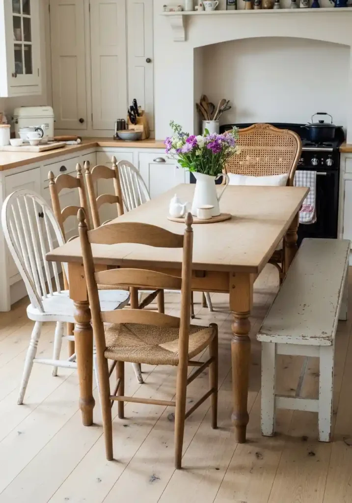 The specific combination of chair styles that creates the most beautifully cozy and the most genuinely characterful mismatched kitchen table collection is one where the chairs share a broad aesthetic family — all wooden, all natural-toned, all roughly the same period sensibility — while differing sufficiently in form, in specific style, and in specific patina that each chair is clearly and genuinely individual. Windsor chairs beside rush-seated ladder-backs beside a rattan armchair beside a simple painted bench creates a table setting of such warm, eclectic, genuinely domestic character that it looks less like a designed dining arrangement and more like the perfectly imperfect gathering of beloved objects that makes a house genuinely, warmly a home.