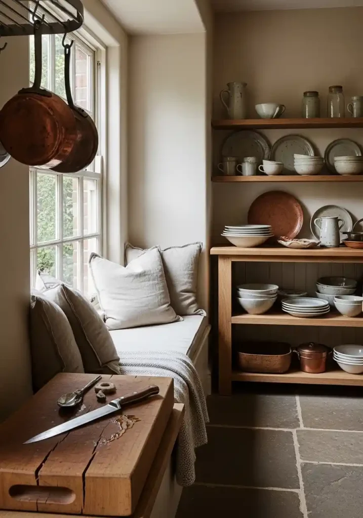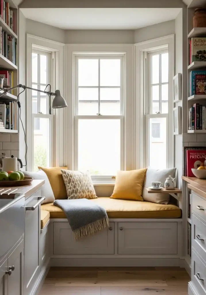 A reading nook built into the kitchen’s corner with a window seat, flanking bookshelves, and proper reading lamp creates the most intimate and the most genuinely beloved cozy destination in any domestic kitchen — because the nook’s specific quality of partial architectural enclosure, its abundance of natural light from the adjacent window, its immediate access to the kitchen’s warmth and fragrance, and its physical comfort of a deep, well-cushioned seat creates a corner of such complete, multi-sensory, genuinely cozy domestic pleasure that it becomes the most sought-after spot in the entire home for every quiet morning, every rainy afternoon, and every peaceful evening hour.