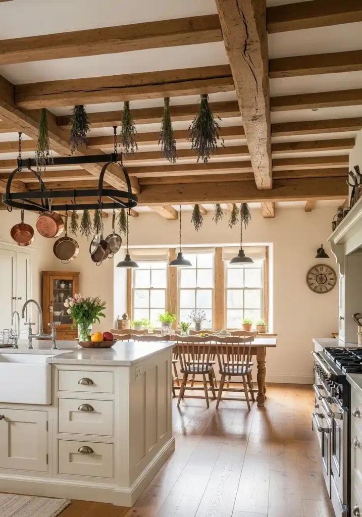 The specific quality that makes exposed wooden kitchen ceiling beams genuinely cozy rather than merely characterful is their ability to lower the psychological perceived ceiling height of the kitchen from the actual ceiling plane down to the beam level — because the visual presence of the beams at approximately head height creates a quality of warm, overhead enclosure that makes the kitchen feel sheltered, intimate, and genuinely cosseting in the specific way that a room with lower ceilings always feels more cozy and more intimate than a room of identical floor area with a higher, more open ceiling. Beams create the ceiling equivalent of a warm hug.