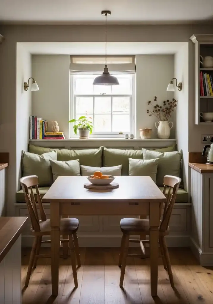 The deep cushions in warm sage green fabric on the built-in inglenook bench seat are the tactile detail that most completely fulfils the seating nook’s cozy promise — because the specific physical pleasure of sinking into a generously cushioned bench seat with proper back support and proper seat depth is so completely different from sitting on a conventional dining chair that the inglenook bench creates a quality of relaxed, comfortable, unhurried physical ease that makes every meal within it feel like an occasion worthy of extended, pleasurable lingering. The inglenook bench invites people to stay longer, to talk more, and to be genuinely, completely at home in the kitchen.