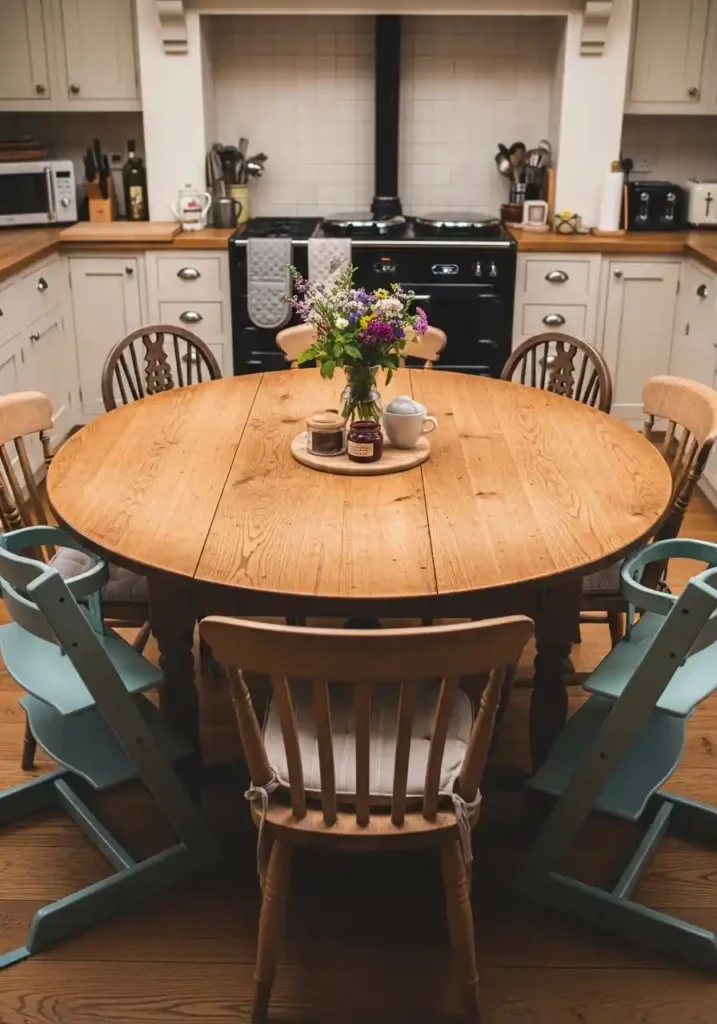 The round form of the central kitchen table is the specific table geometry that creates the most complete social equality and the most genuinely warm gathering quality — because the round table has no head and no foot, no better position and no worse position, every person seated at it equally central and equally part of every conversation simultaneously. A round kitchen table with mismatched chairs gathered around it, children’s drawings on the counter behind it, and fresh garden flowers in a jam jar at its center is the most honest, the most warmly domestic, and the most genuinely cozy kitchen furniture arrangement available — the furniture of a genuinely, completely lived-in family kitchen.