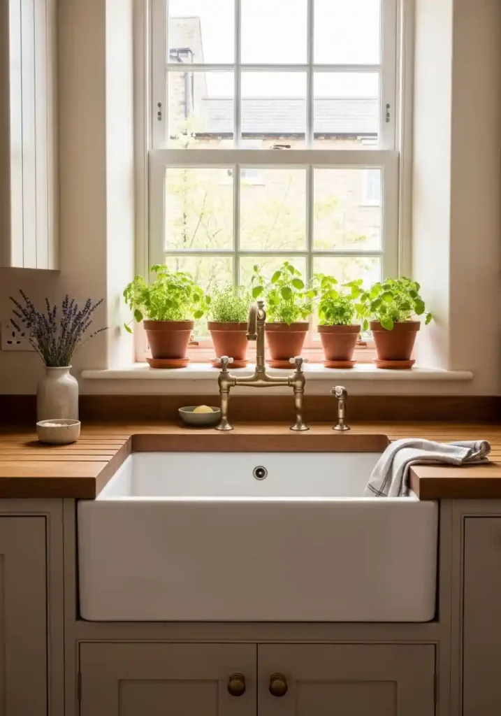 The herb garden established on the window sill directly above the farmhouse sink is the sensory detail that most completely fulfills the cozy kitchen’s promise of natural abundance and genuine domestic warmth — because herbs positioned in terracotta pots above the sink are simultaneously in the most naturally lit, the most conveniently watered, and the most immediately fragrant position in the entire kitchen, filling the sink area with the specific, warm, botanical fragrance of fresh rosemary, basil, and mint that makes the kitchen smell like the most welcoming and the most genuinely nourishing place in the entire home. Fresh herbs above a farmhouse sink are the cozy kitchen’s most perfect sensory combination.