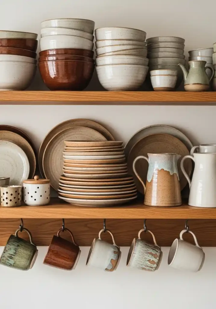 The specific qualities of handmade stoneware that create the most beautiful and the most cozy kitchen pottery display are the ones that reveal the maker’s hand most clearly and most beautifully — the slight variations in glaze depth between adjacent pieces where the glaze has pooled slightly differently during firing, the throwing marks on the exterior of hand-thrown bowls showing the movement of the potter’s hands, the organic slight irregularity of rim profiles that prevents any two pieces from being exactly identical, and the warm, slightly matte quality of stoneware glazes that absorb kitchen light gently rather than reflecting it sharply. These marks of genuine making are the pottery’s most precious qualities.