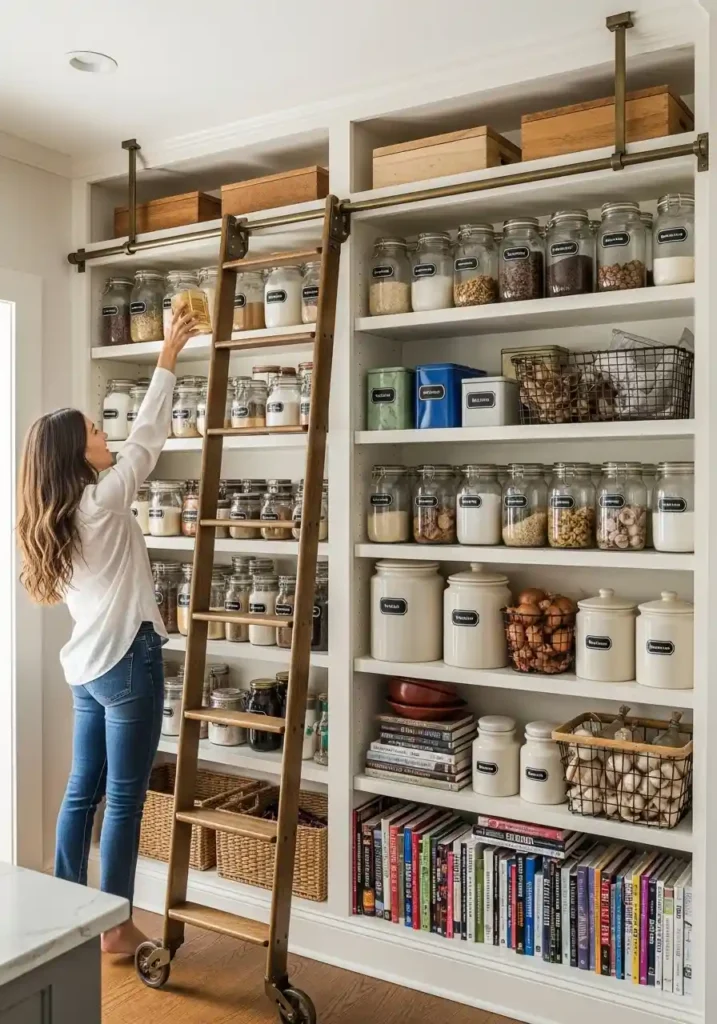 The storybook quality of a kitchen pantry ladder comes not just from the ladder itself but from the beautifully organized pantry shelves it serves — because a floor-to-ceiling pantry of uniform glass storage jars with handwritten labels, vintage tins in coordinating warm colors, ceramic storage crocks with wooden lids, and cookbooks organized by cuisine creates a pantry display of such complete, warm, genuinely inspiring domestic abundance that it makes cooking feel like a joyful act of creative engagement with a well-stocked, beautifully considered kitchen rather than a daily chore completed with whatever happens to be available. The beautiful pantry makes every cooking session feel genuinely privileged.